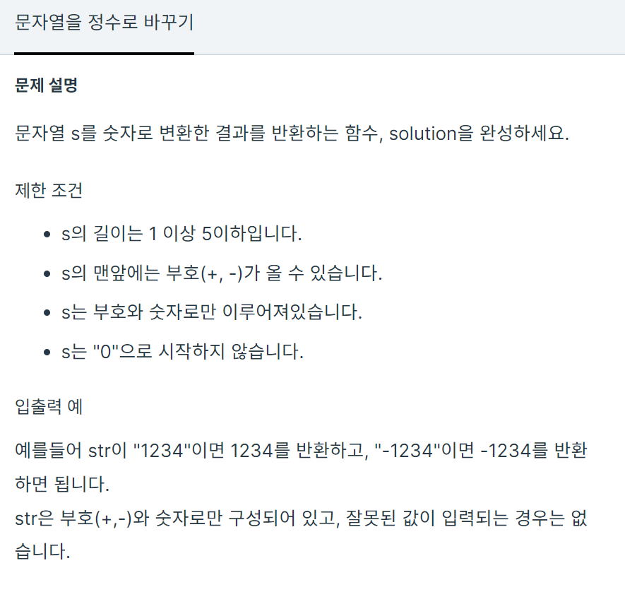 문자열 s를 숫자로 변환한 결과를 반환하는 함수, solution을 완성하세요. 제한 조건 s의 길이는 1 이상 5이하입니다. s의 맨앞에는 부호(+, -)가 올 수 있습니다. s는 부호와 숫자로만 이루어져있습니