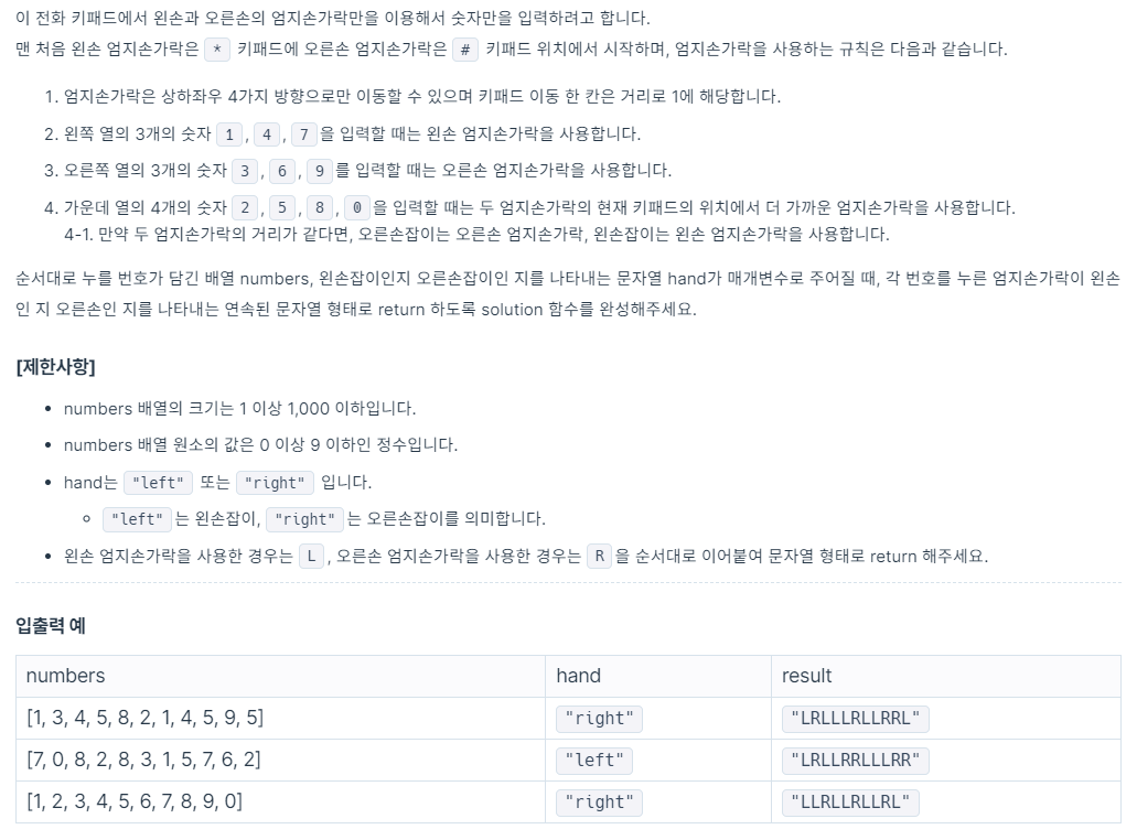 https://programmers.co.kr/learn/courses/30/lessons/67256 코딩테스트 연습 - 키패드 누르기 [1, 3, 4, 5, 8, 2, 1, 4, 5, 9, 5] "right" "LRLLLRLLRRL" [7, 0, 8, 2, 8, 3, 1, 5, 7, 6, 2] "left" "LRLLRRLLLRR..