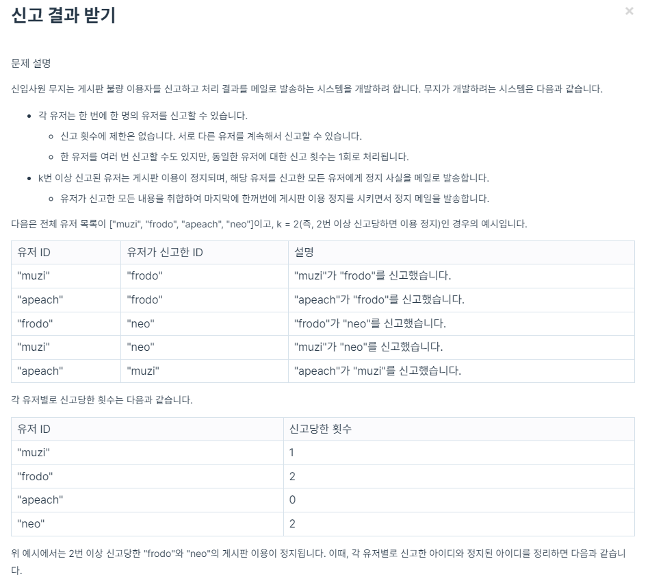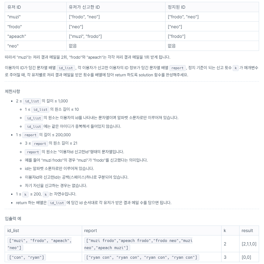 문제 설명 신입사원 무지는 게시판 불량 이용자를 신고하고 처리 결과를 메일로 발송하는 시스템을 개발하려 합니다. 무지가 개발하려는 시스템은 다음과 같습니다. 각 유저는 한 번에 한 명의