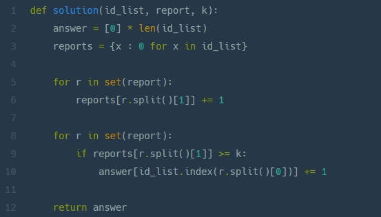 set() 사용해서 중복제거 한 report 값 r 중에서 split() 으로 띄어쓰기로 조졌잖음?