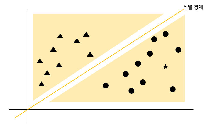 이걸 프로그램으로 처리한다면 ●와 ▲ 사이에 식별 경계라는 직선을 긋고 대상이 직선 위에 있는지 아래에 있는지 판단하게 될 것이다.