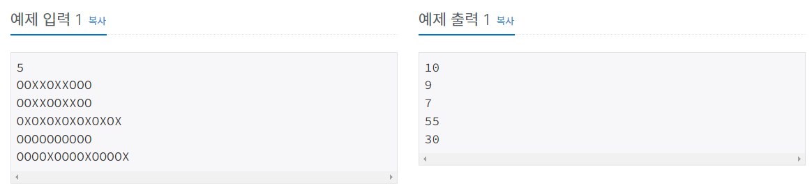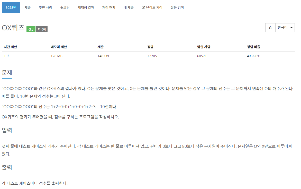 "OOXXOXXOOO"와 같은 OX퀴즈의 결과가 있다. O는 문제를 맞은 것이고, X는 문제를 틀린 것이다. 문제를 맞은 경우 그 문제의 점수는 그 문제까지 연속된 O의 개수가 된다. 예를 들어, 10번 문제의 점수