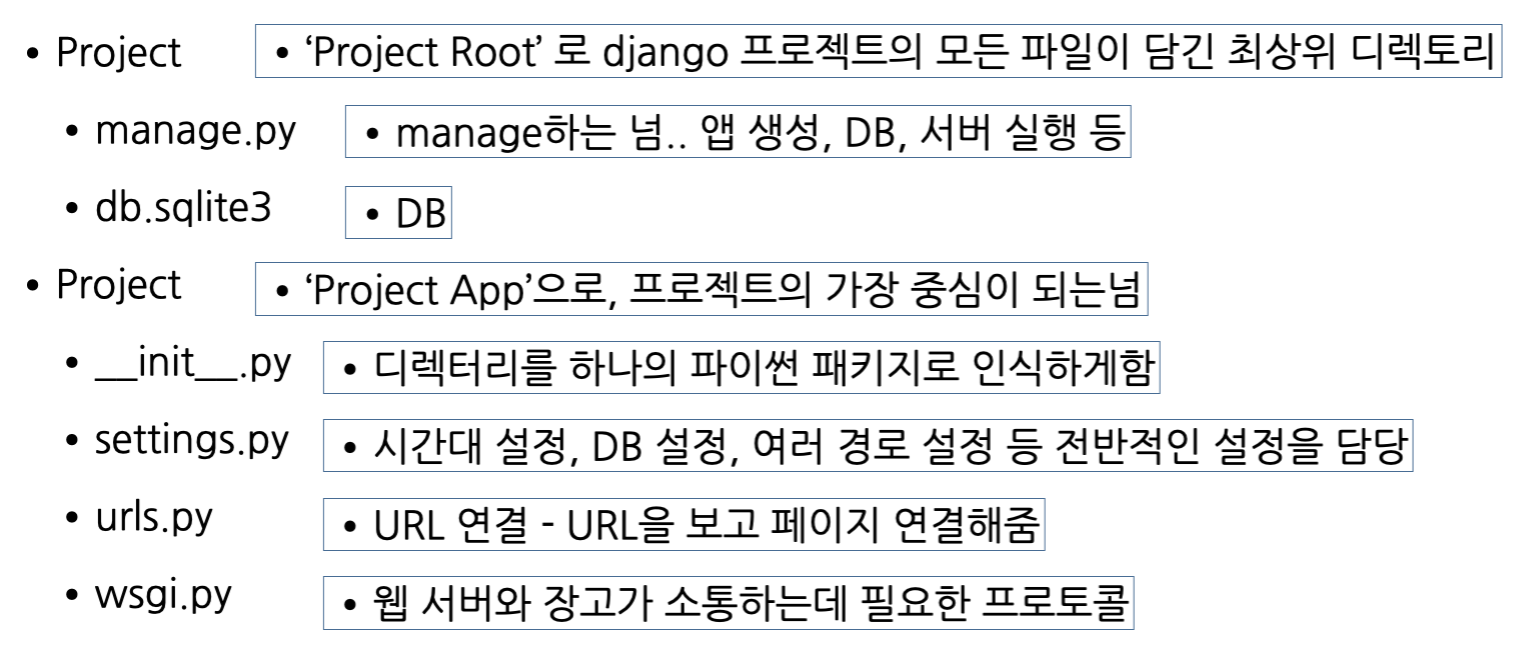 Project Root 안에 있는 프로젝트 명(project) 디렉토리는 Django 프로젝트를 위한 여러 파일이 담겨 있는 디렉토리임