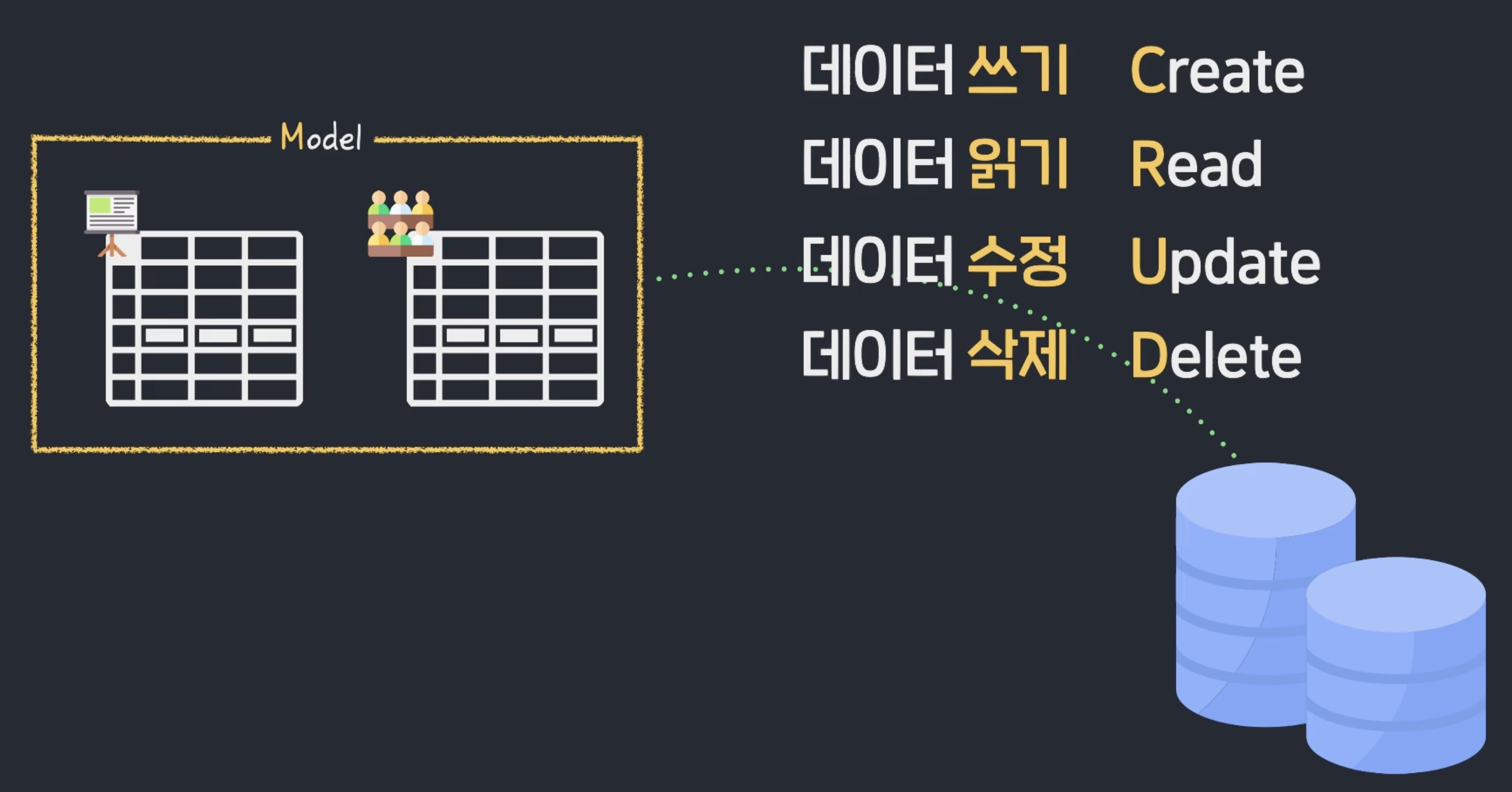 이런 정보를 우리가 model에 정의하면 우리는 정의한 데이터베이스와 소통하며 데이터를 CRUD 하게 된다.