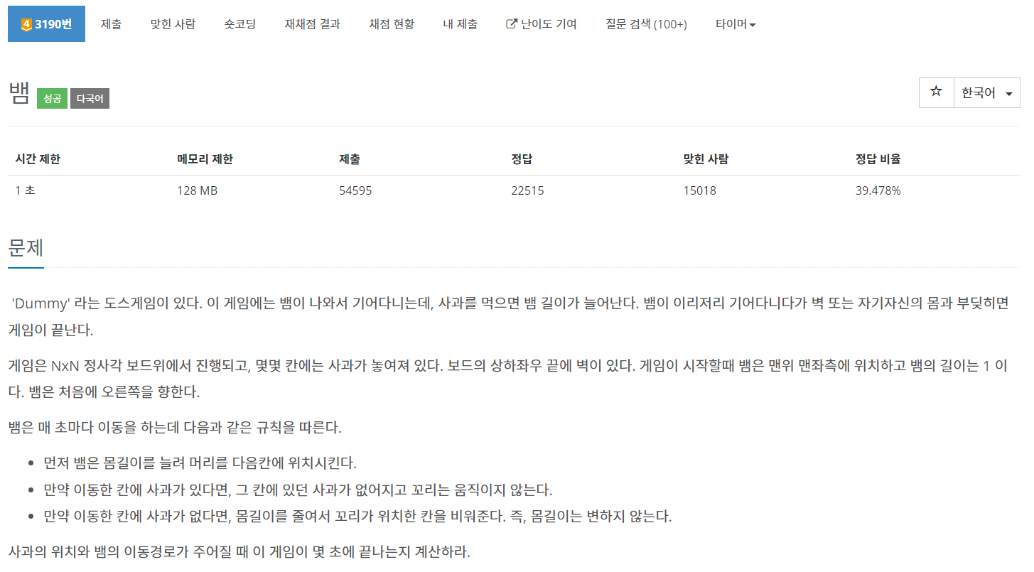 https://www.acmicpc.net/problem/3190