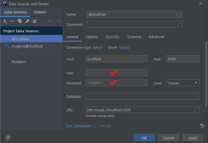 4. 이런 화면이 뜹니다. 여기에 mysql에서 만든 DB user, passwd 값을 넣어주면 됩니다. (기본 user는 root)