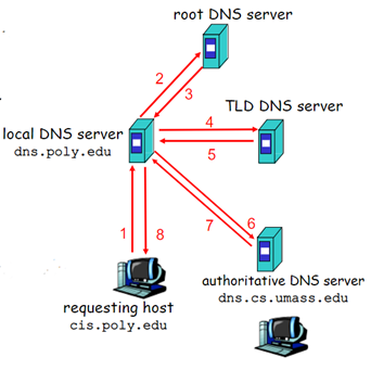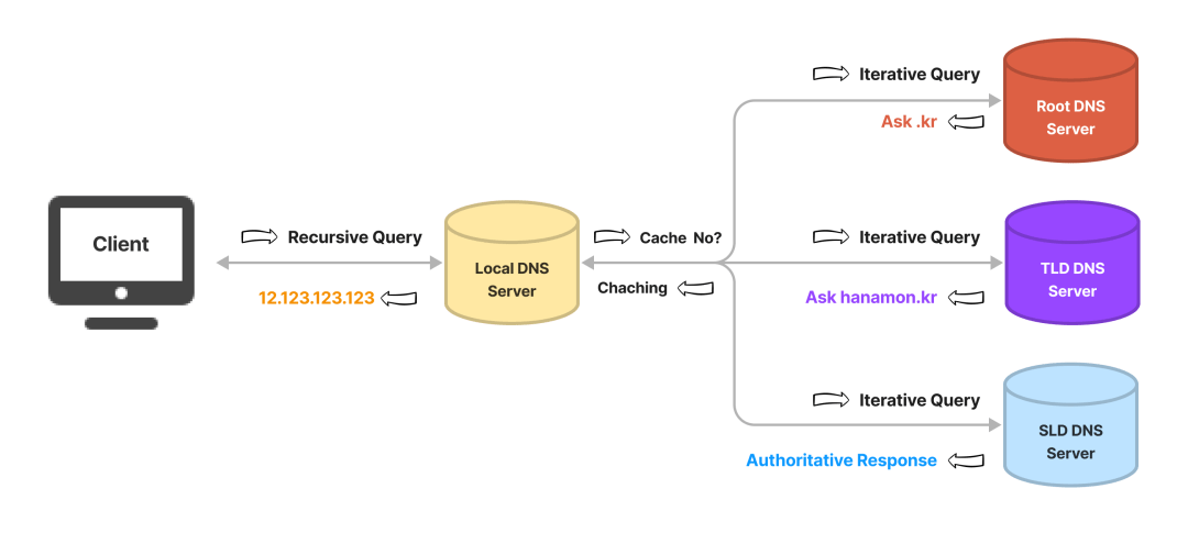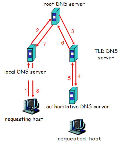 예를 들어 호스트가 naver.com에 대해 query를 보내면 Local DNS 서버가 root name server에 query를 보내 com 담당 서버의 주소를 받고, 다시 com 담당 서버에 query 를 보내 naver.com이 변환 요청을 보낸다.