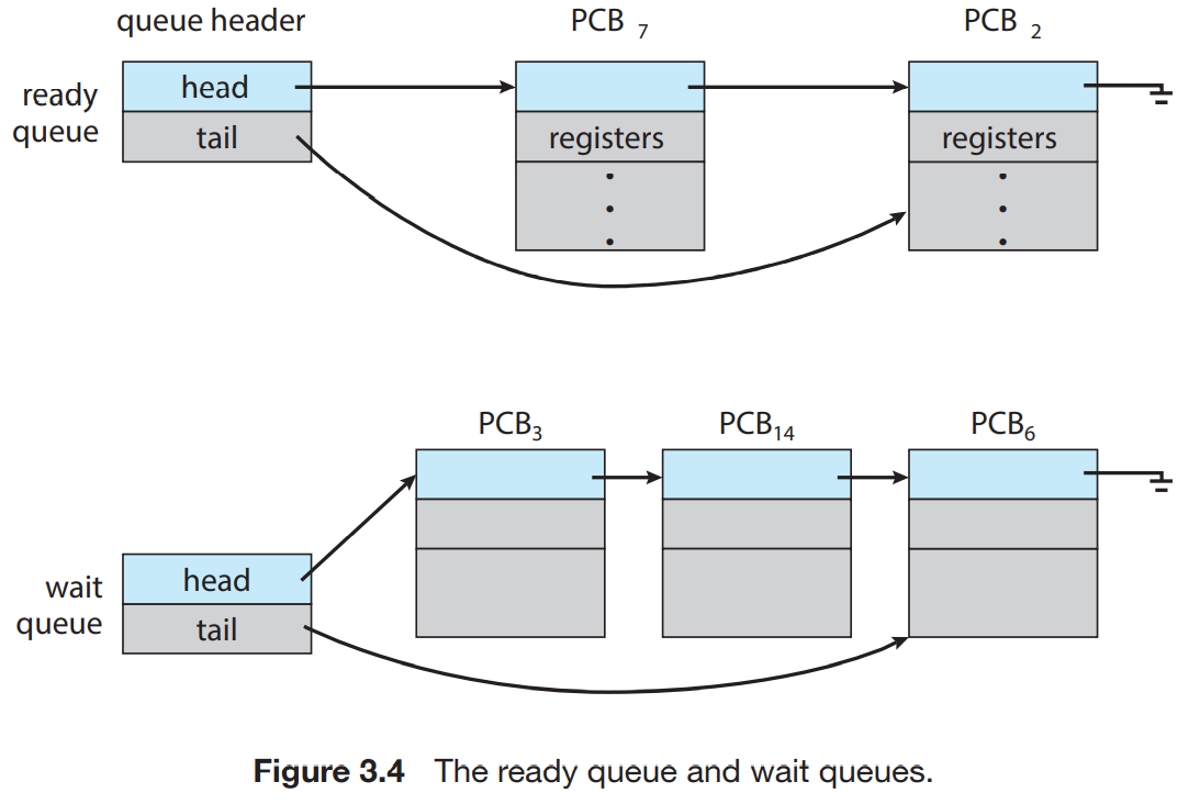 - ready queue에 있던 프로세스가 CPU를 할당받아 작업을 수행하다가 I/O request, interrupt, for a child 등의 이벤트가 발생하면 다시 대기 상태로 변경된다.