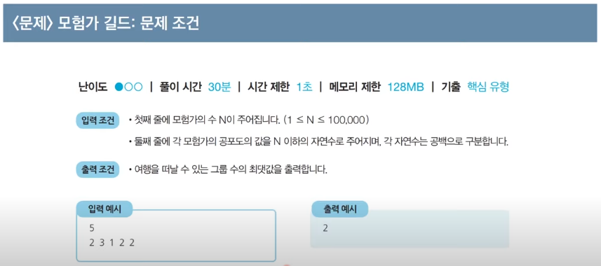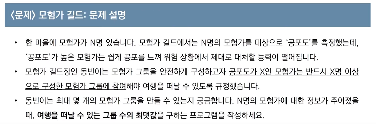 그룹 인원수 >= 확인한 자리 사람의 공포도 가 될 때 이를 그룹으로 선택하고 result group에 +1을 해주면 된다. (count=0으로 초기화)