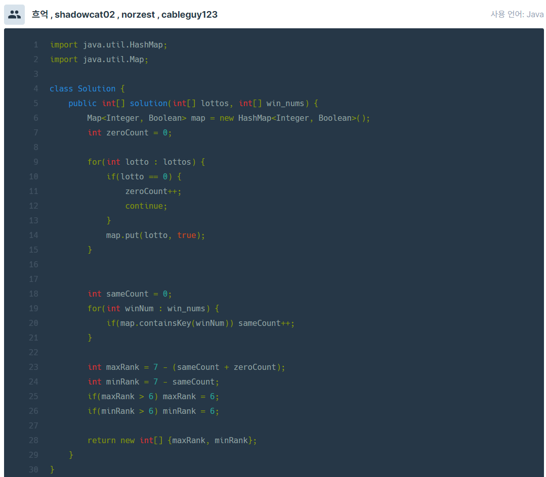 map함수의 containsKey를 사용하여 map 안에 win_nums의 값이 있는지 확인하고 있으면 sameCount++ 해줬다.