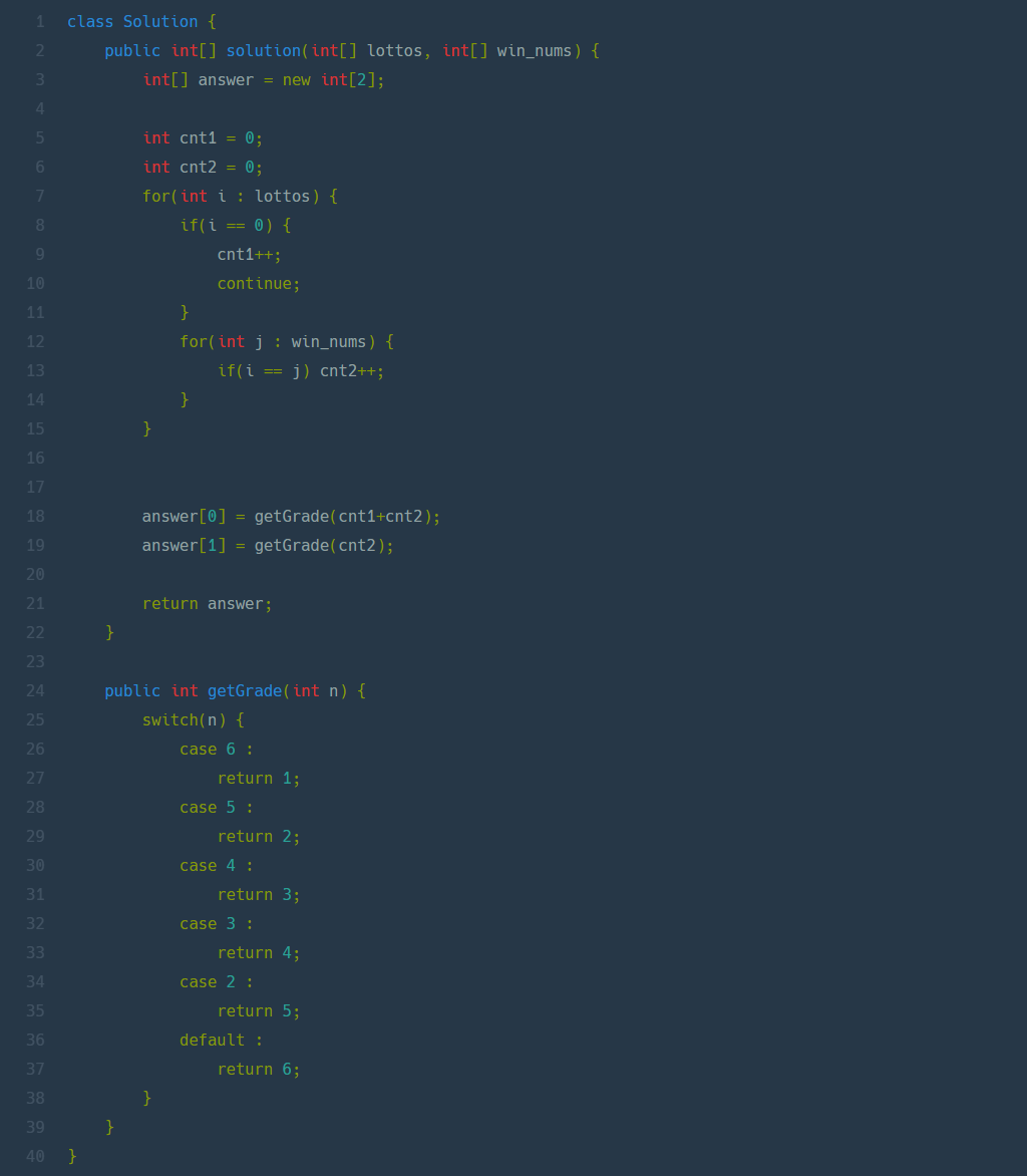 그래서 0을 뺀 로또번호와 당첨번호를 비교해서 맞춘 개수 + 0의 개수가 다 맞춘 경우, 맞춘 개수만 하는게 다 틀렸을 경우이다.