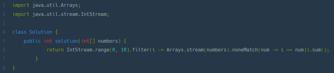 0부터 9까지의 숫자 중 일부가 들어있는 배열 numbers가 매개변수로 주어집니다. numbers에서 찾을 수 없는 0부터 9까지의 숫자를 모두 찾아 더한 수를 return 하도록 solution 함수를 완성해주세요. 제한
