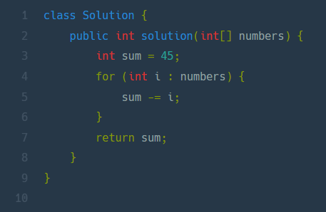 구하는게 없는 숫자의 합이므로 1~9까지 더한 45에서 numbers를 모두 더한 값을 뺐다.