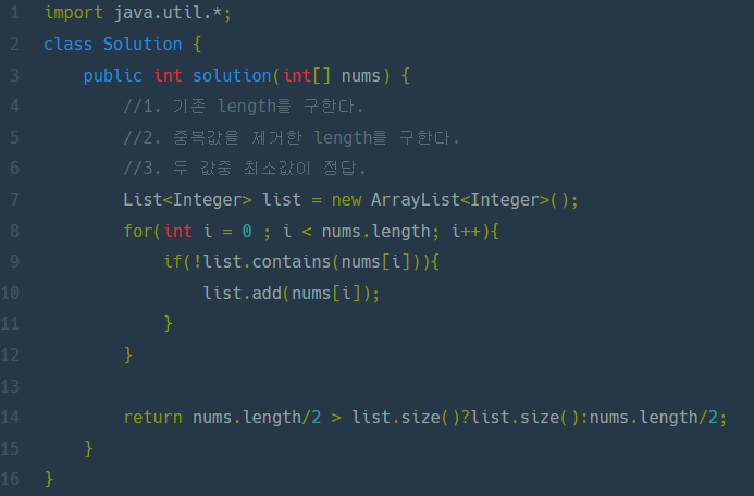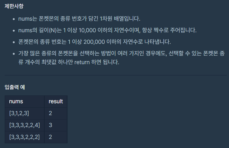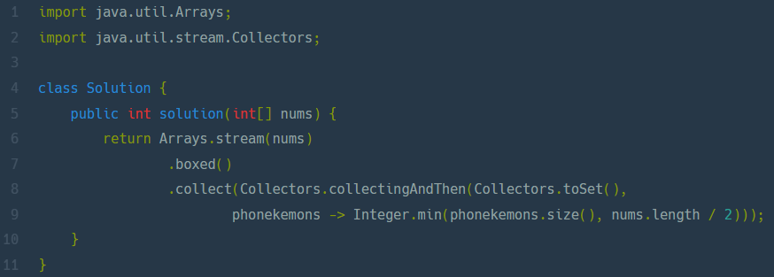 폰켓몬 종류(phonekemons.size())와 가질 수 있는 개수(nums.length/2) 중에 작은걸 담는다.