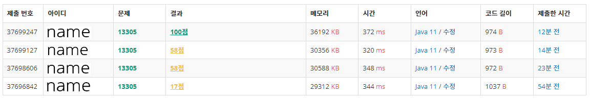처음에 처음 가격을 min으로 안하고 그냥 뭐랄까... 하나하나 기름값을 앞뒤로 비교했더니 17점 나왔다. (서브태스크)