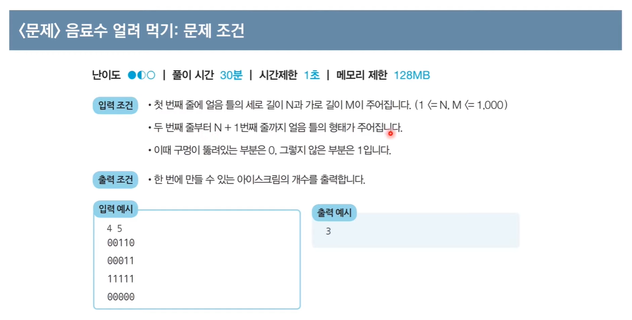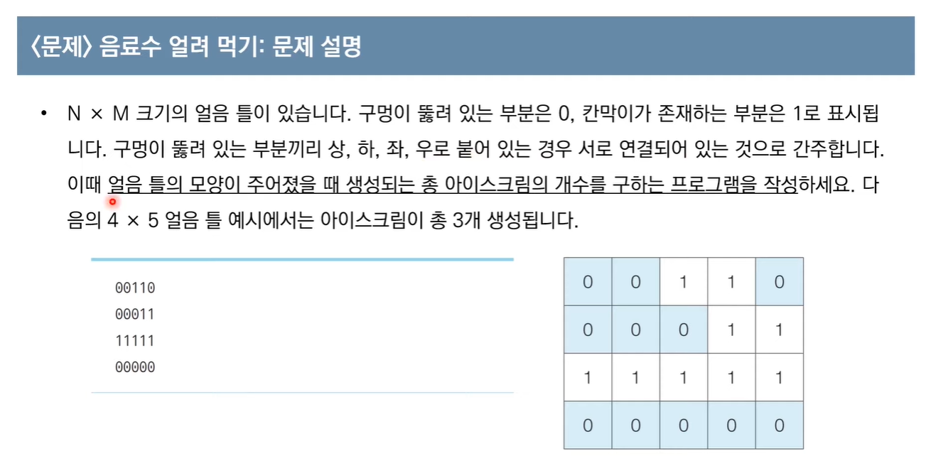 DFS의 예시로 음료수 얼려먹기 문제를 살펴보도록 하자.