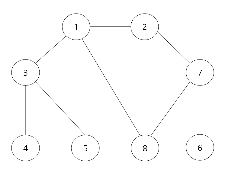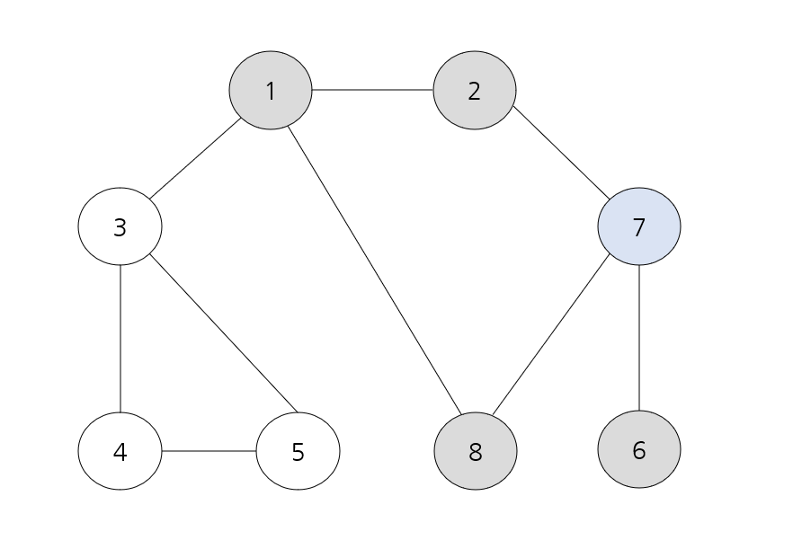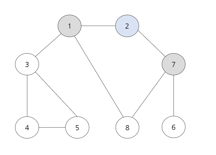 시작 노드 1에서 인접한 노드는 '2', '3', '8' 이다.