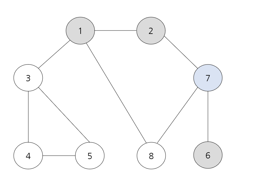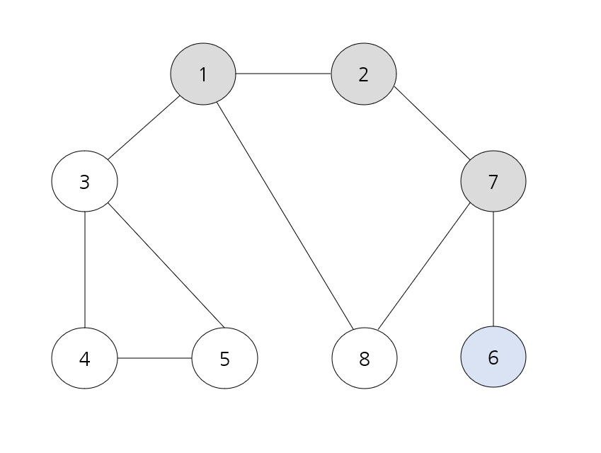 노드 7의 인접 노드 '6', '8' 중 작은 번호인 노드 6에 방문한다.