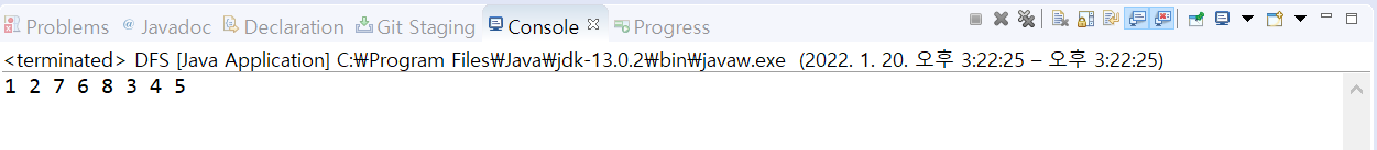코드 결과값을 통해 DFS를 이용한 노드 탐색 순서를 한눈에 볼 수 있다.