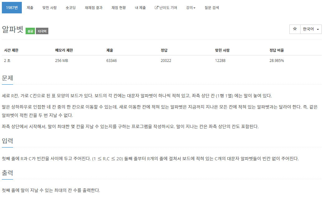 세로 R칸, 가로 C칸으로 된 표 모양의 보드가 있다. 보드의 각 칸에는 대문자 알파벳이 하나씩 적혀 있고, 좌측 상단 칸 (1행 1열) 에는 말이 놓여 있다. 말은 상하좌우로 인접한 네 칸 중의 한 칸으