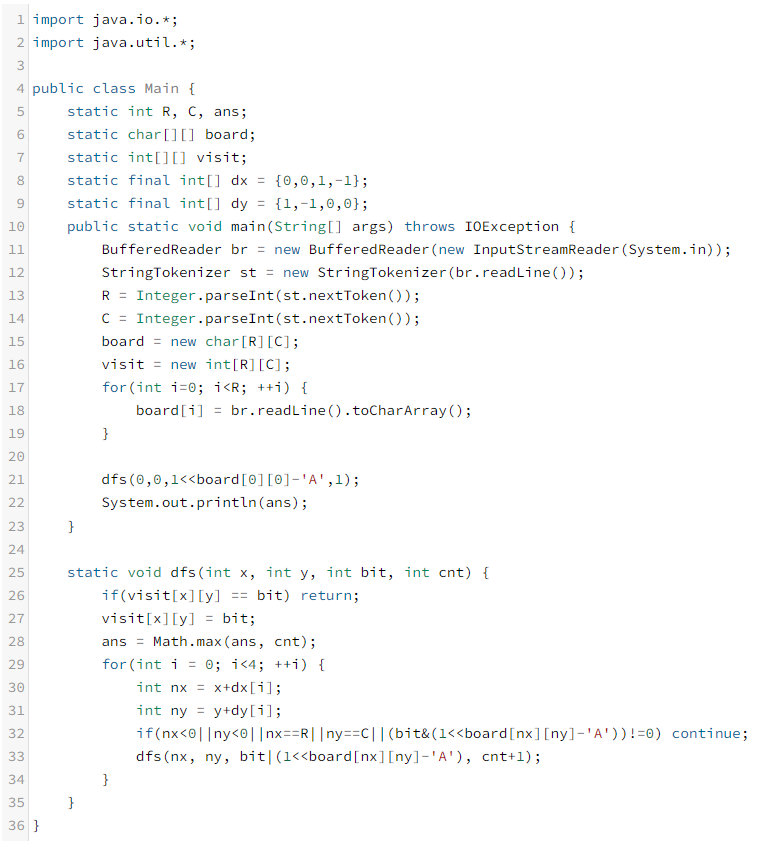 우선 21번째 줄 1 << board[0][0] - 'A' 에서 -'A'를 함으로써 board[][] 값이 A이면 0 ~ Z이면 25 까지 나오게 된다.