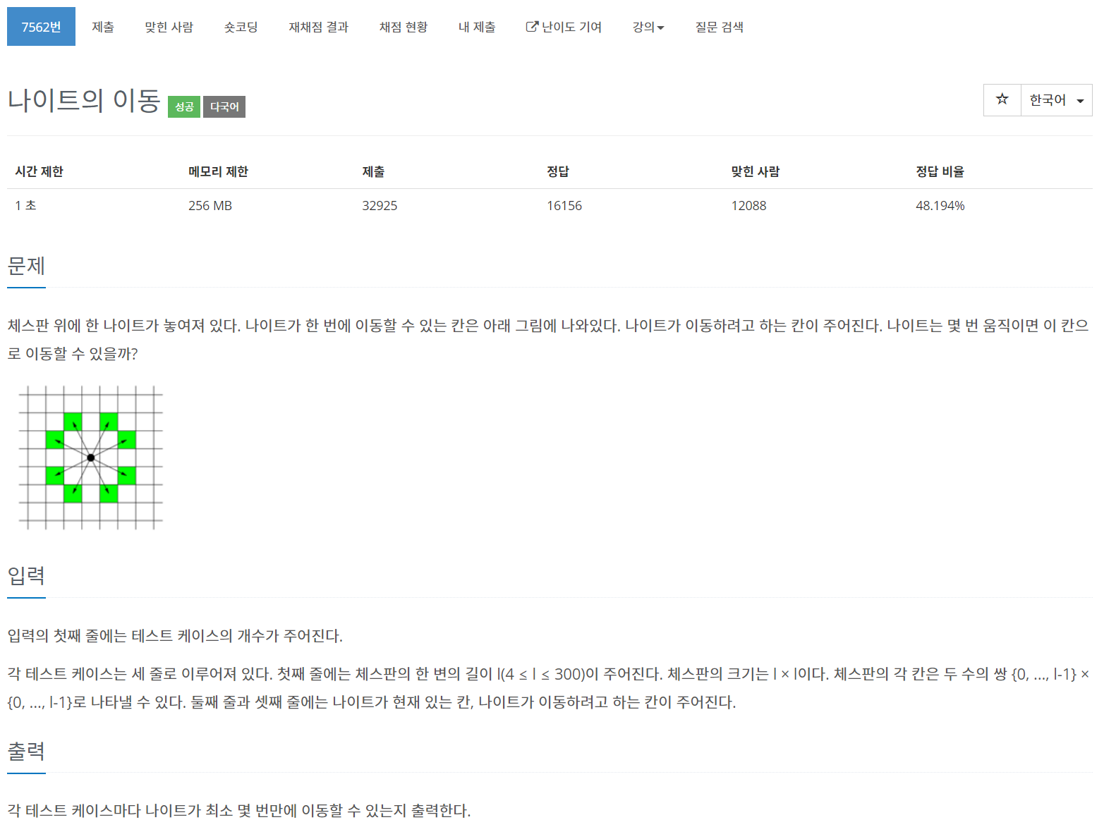 체스판 위에 한 나이트가 놓여져 있다. 나이트가 한 번에 이동할 수 있는 칸은 아래 그림에 나와있다. 나이트가 이동하려고 하는 칸이 주어진다. 나이트는 몇 번 움직이면 이 칸으로 이동할 수