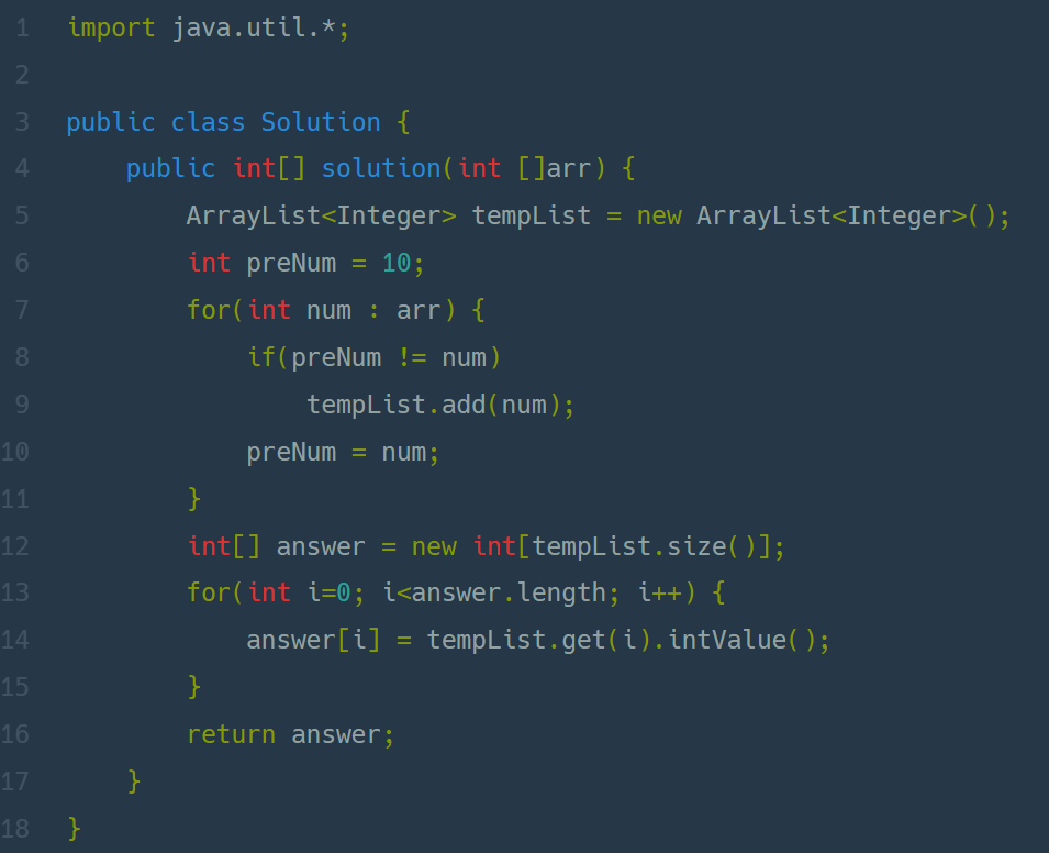 arrayList 생성해서 앞 숫자 preNum과 넣으려는 수가 같이 않으면 리스트에 넣어준다.