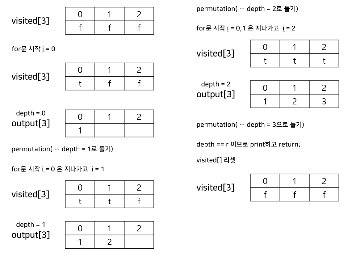 static void permutation(int[] arr, int[] output, boolean[] visited, int depth, int n, int r)