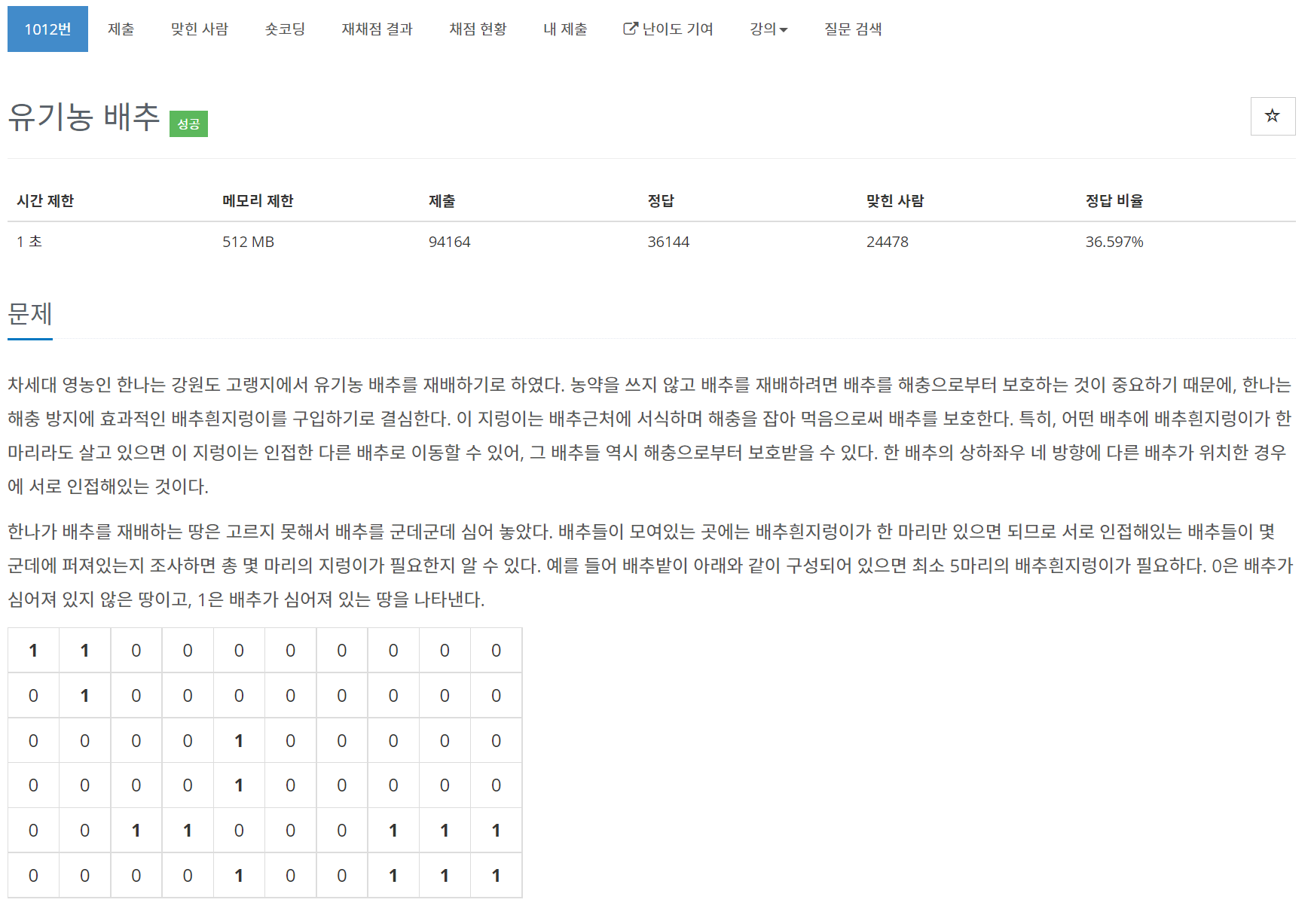 https://www.acmicpc.net/problem/1012 1012번: 유기농 배추 차세대 영농인 한나는 강원도 고랭지에서 유기농 배추를 재배하기로 하였다. 농약을 쓰지 않고 배추를 재배하려면 배추를 해충으로부터 보호하는 것이 중요하기 때문에, 한나는 해충 방지에 www.acmicpc.net 얘도 그냥 전형적인 DFS/BFS 문제이다. DFS 연습중이라 DFS로 풀음 코드 import java.io.BufferedReader; import java.io.IOException; import java.io.InputStreamReader; import java.util.StringTokenizer; public class Baek1012 { // DFS public static int count[] ..