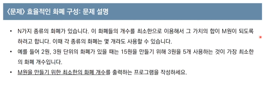 문제 3. 효율적인 화폐 구성 문제 풀이 방식 다음과 같이 점화식을 만들 수 있다. 화폐는 10,000 이하인 값이므로 각 인덱스는 10,001 값으로 초기화 해준다. 화폐의 단위가 2일 때를 살펴보면 인덱스 2의 값은 2 하나로, 4는 2 두 개로, 6은 2 세 개로 만들 수 있다. 화폐의 단위가 3일 때를 살펴보면 인덱스 3의 값은 3 하나로, 6은 3 두 개로 표현할 수 있다. 여기서 인덱스 5와 7도 만들 수 있다. 인덱스 5에서 3칸 앞을 살펴보면 2가 있으므로 2의 값에 3을 더하면 5라서 인덱스 2의 값인 1 + 1을 해줘 2가 됨 인덱스 7도 3칸 앞을 살펴보면 인덱스 2를 두 개 활용한 4가 있음. 인덱스 4 값인 2 + 1 해줘서 3이 됨 화폐의 단위가 5일 때를 살펴보면 인덱스 5는 ..