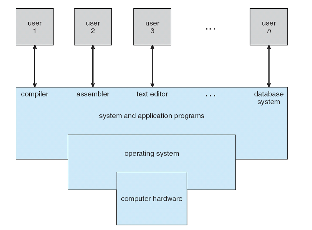✨운영체제란? 운영체제는 컴퓨터 사용자와 하드웨어 사이에서 중개자(intermediary) 역할을 한다. 운영체제의 목적은 사용자가 프로그램을 편하고 효율적으로 수행할 수 있는 환경과 컴퓨터 하드웨어를 사용하는 효율적인 방식을 제공하는 것이다. 컴퓨터 시스템은 크게 네 가지로 구분된다. 하드웨어 운영체제 응용 프로그램 사용자 하드웨어 CPU(중앙처리장치), 메모리, I/O (입출력 장치)로 구성되어 기본 계산용 자원을 제공 응용 프로그램 워드 프로세서, 스프레드 시트, 컴파일러 등 이들 자원이 어떻게 사용될지 결정 운영체제 운영체제는 다양한 사용자를 위해 다양한 응용 프로그램 간의 하드웨어 사용을 제어하고 조정할 수 있도록 환경을 제공 운영체제는 컴퓨터 시스템이 동작할 때 이들 자원을 적절하게 사용할 수..